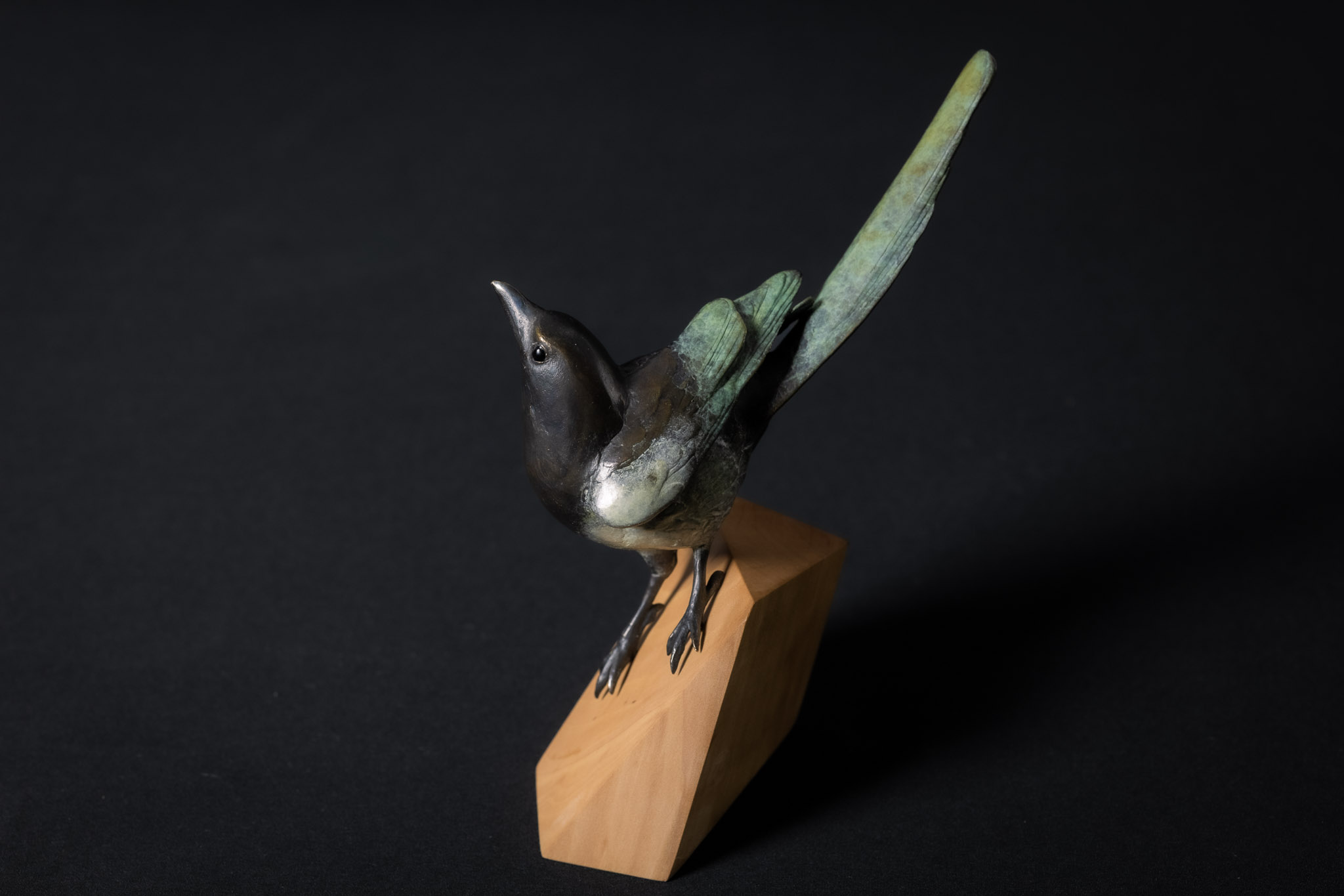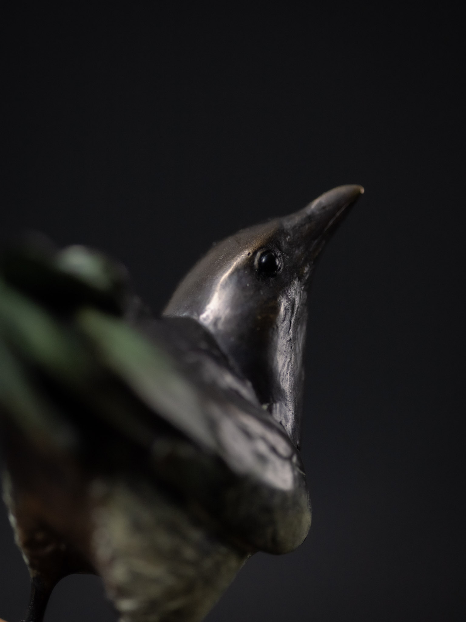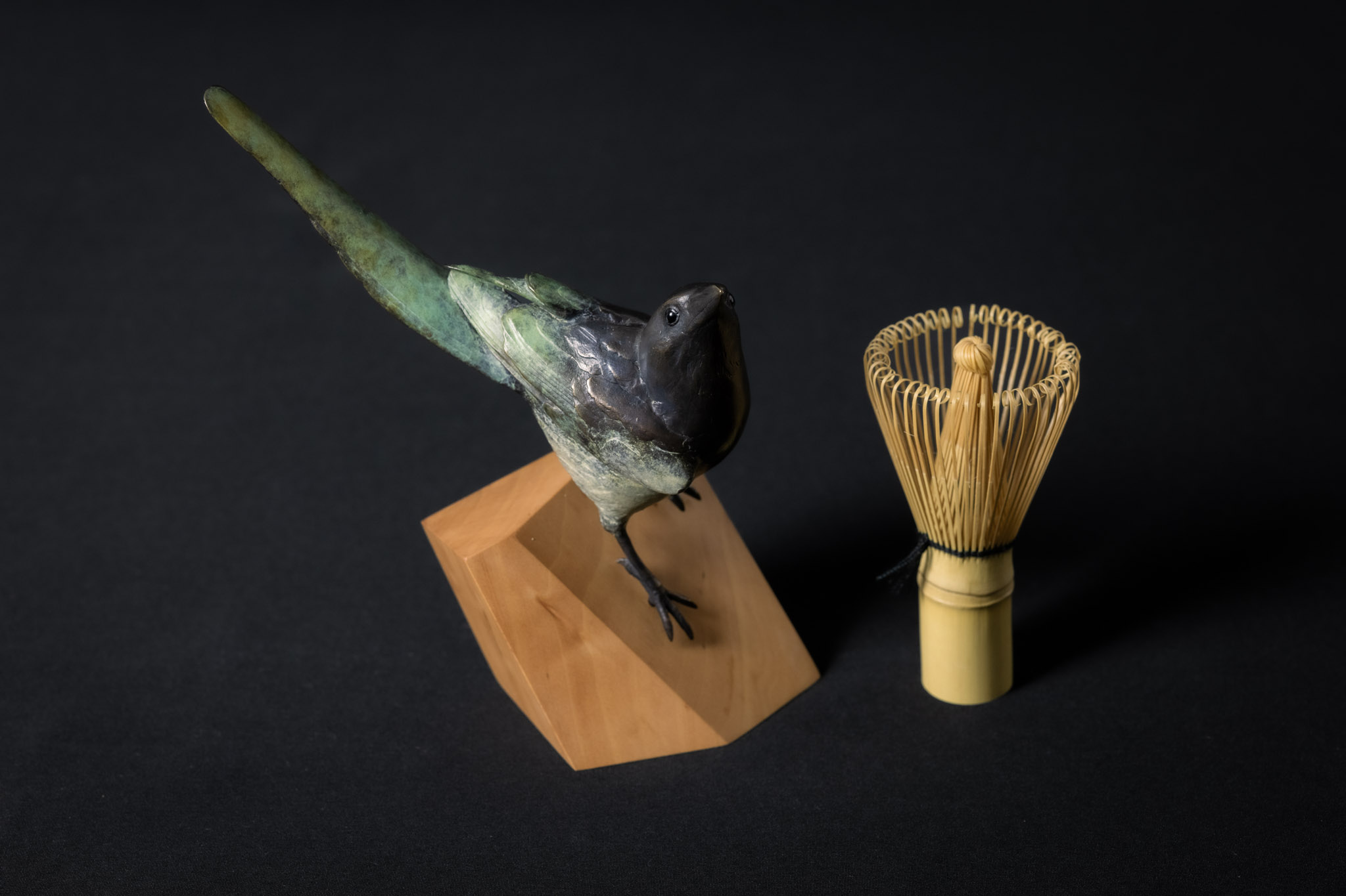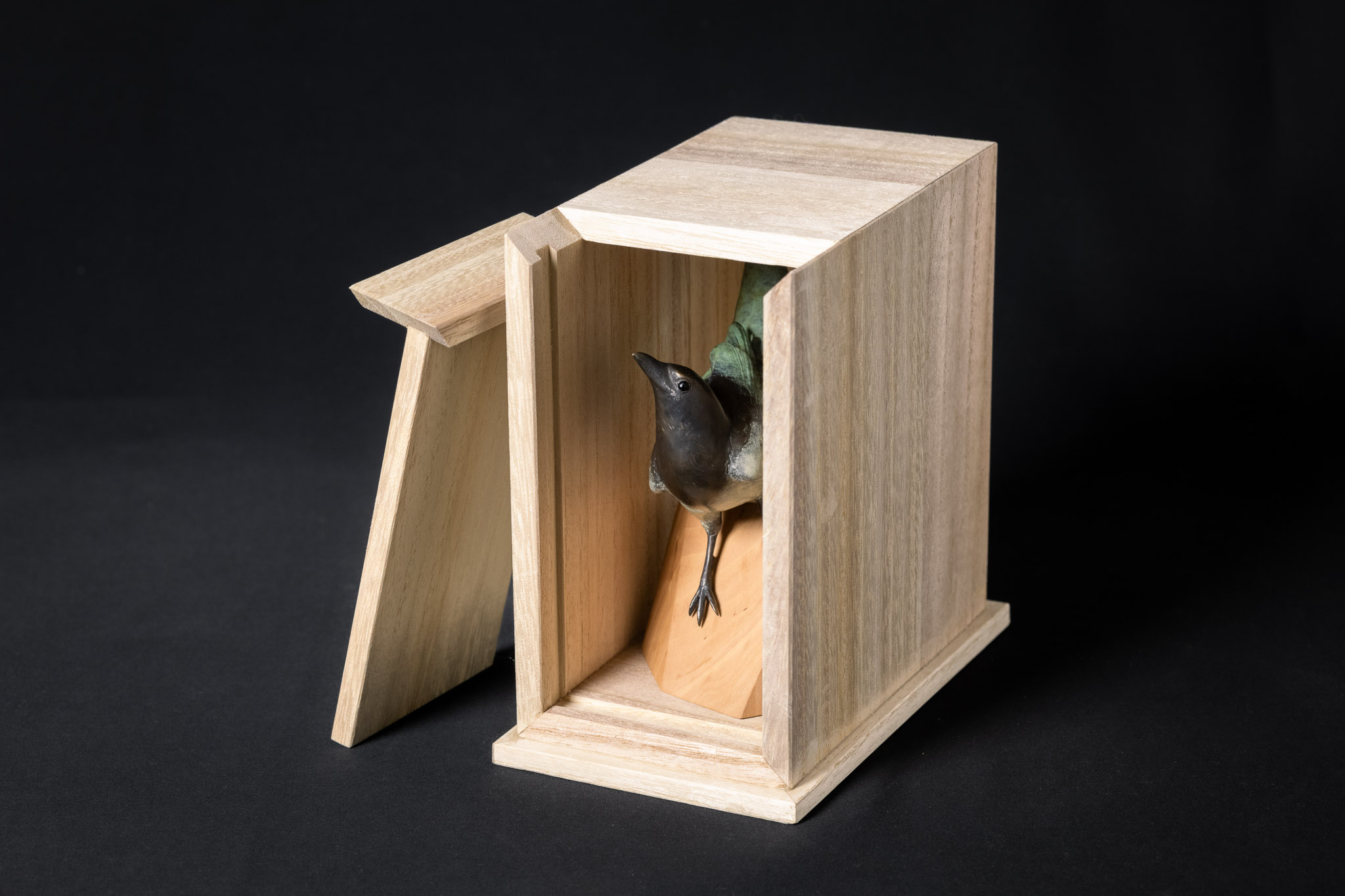Bronze magpie on wooden stand, urushi lacquered eyes. Handcrafted kiri box included.