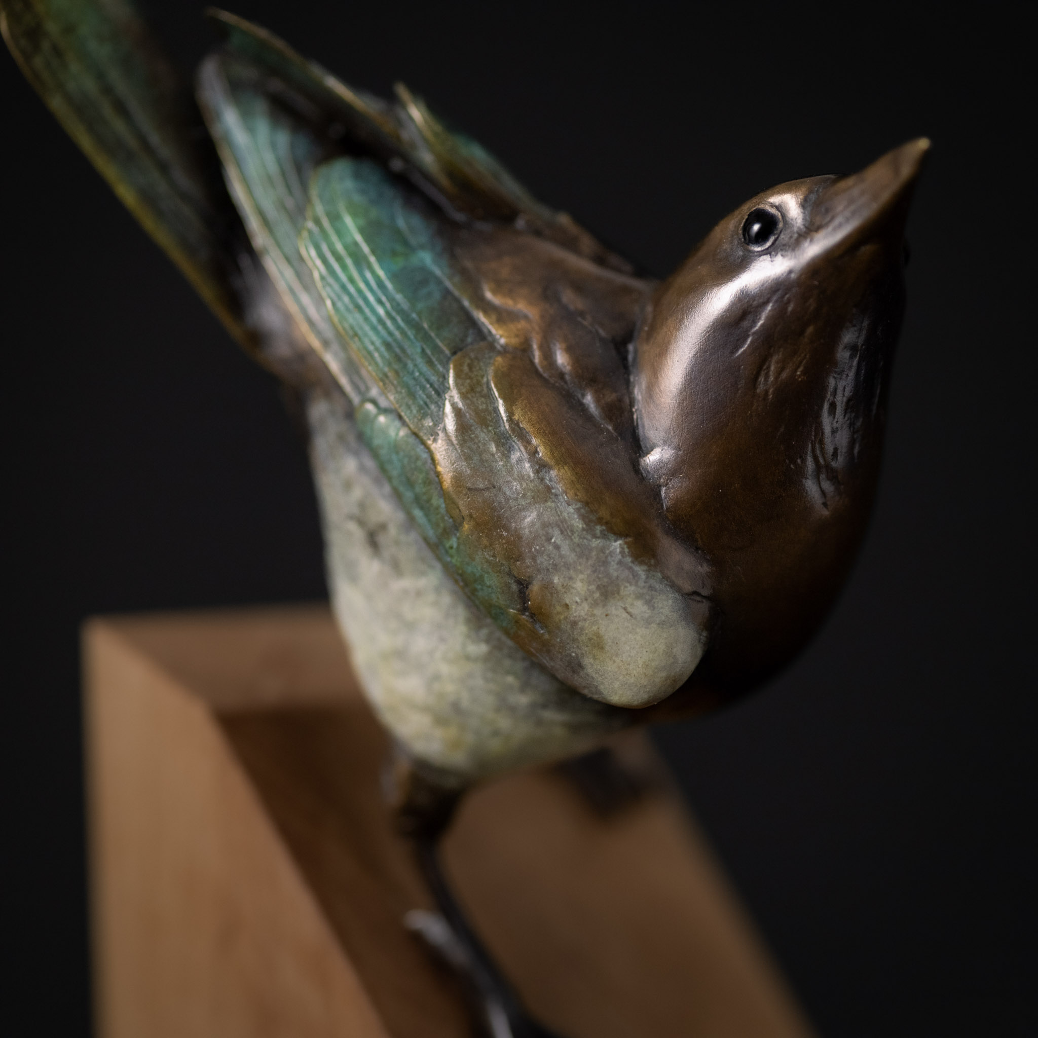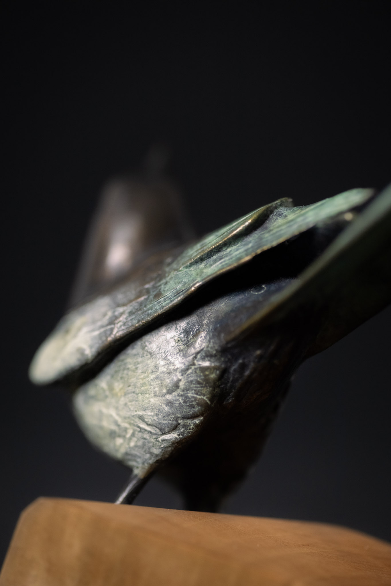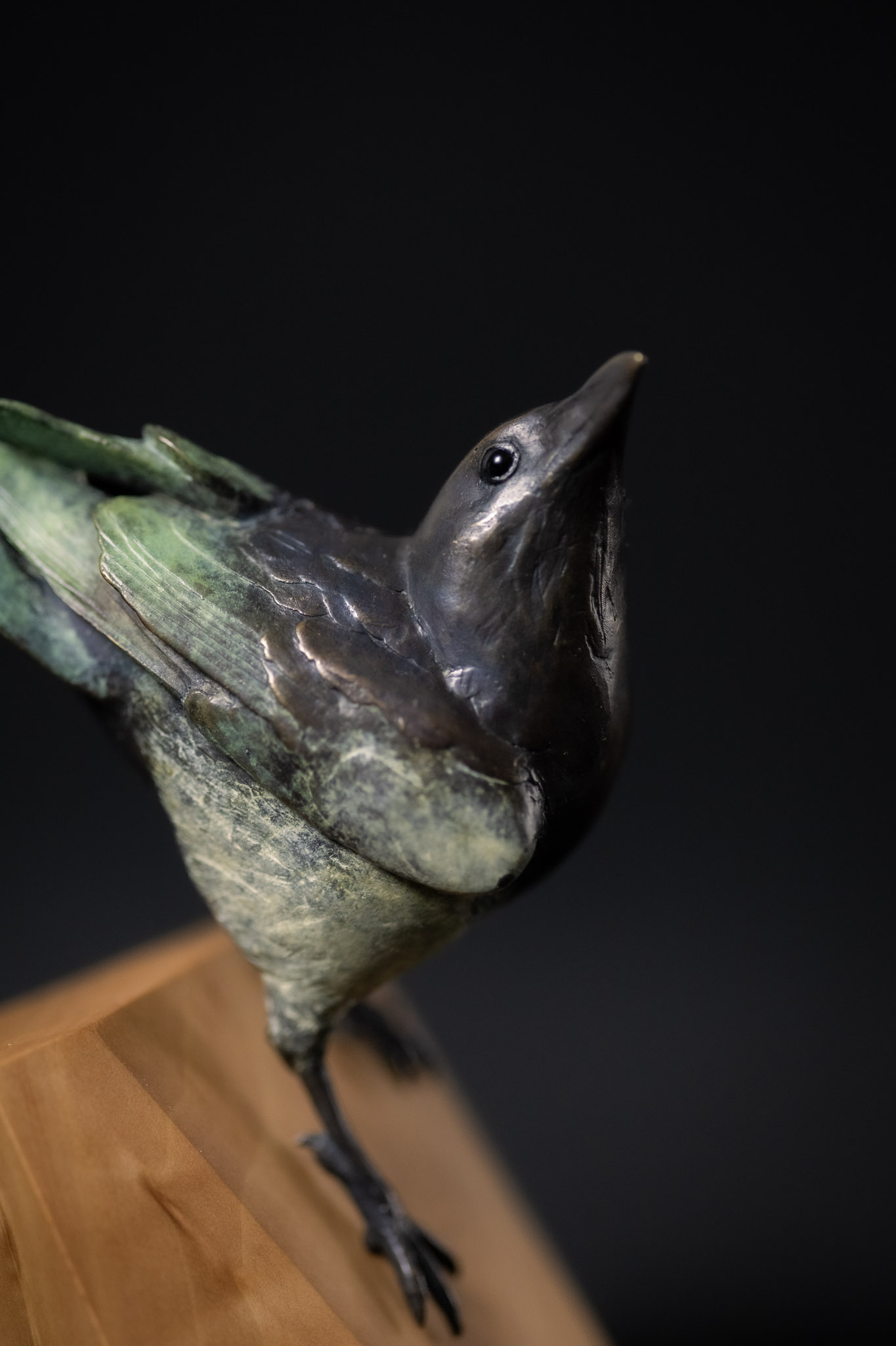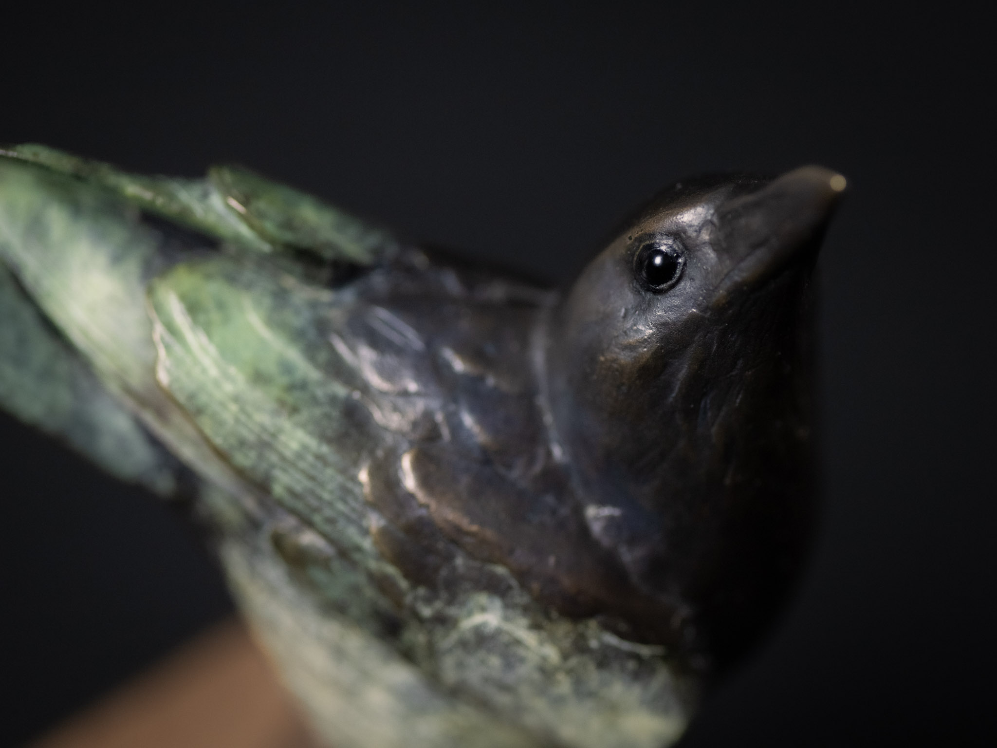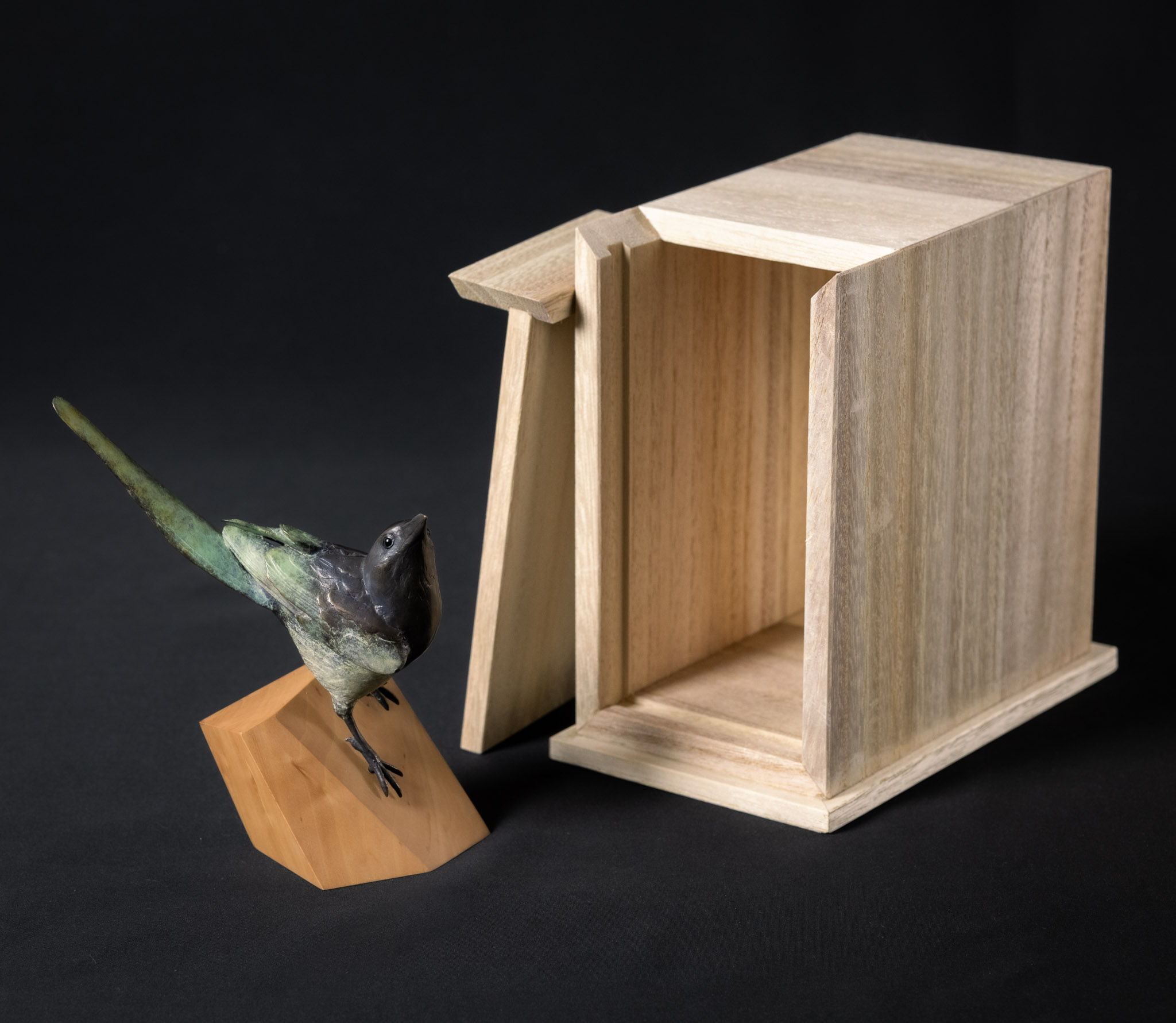 Bronze magpie on wooden stand, urushi lacquered eyes. Handcrafted kiri box included.